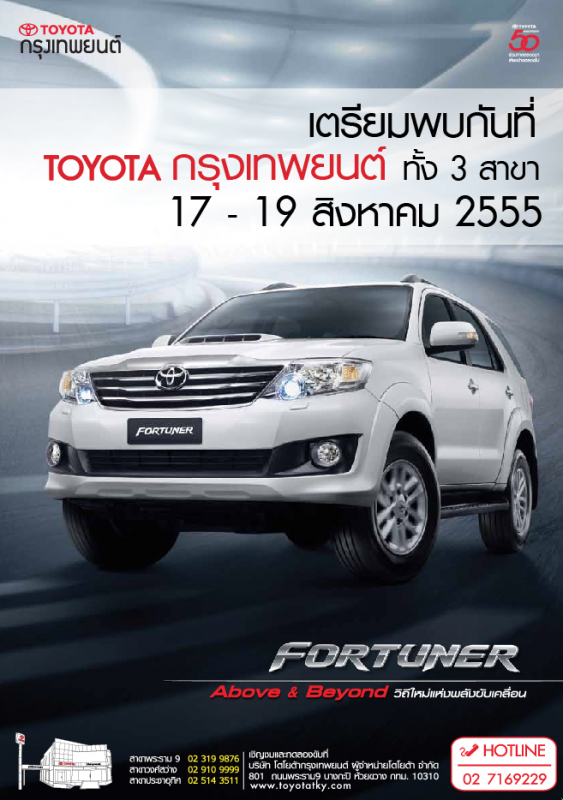 โตโยต้ากรุงเทพยนต์ เชิญร่วมสัมผัสอีกระดับแห่งความท้าทายกับ NEW TOYOTA FORTUNER และ VIGO เกียร์อัตโนมัติ 5 สปีด ปลุกเร้าทุกความท้าทาย ด้วยประสิทธิภาพการทำงานของเครื่องยนต์ที่เหนือกว่า ควบคุมทุกจุดหมายด้วยพลังที่เหนือใคร พร้อมมาตรฐาน EURO 4 เทคโนโลยีการผลิตรถยนต์ที่พัฒนาปรับปรุงคุณภาพน้ำมันเชื้อเพลิงขึ้นเพื่อรักษาสิ่งแวดล้อม ลดปัญหามลพิษทางอากาศ ตามนโยบายมาตรฐานสากลของสหภาพยุโรป 17-19 สิงหาคมนี้ ที่โตโยต้ากรุงเทพยนต์ทุกสาขา
