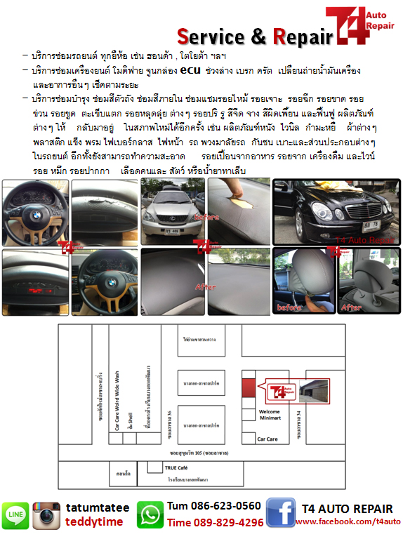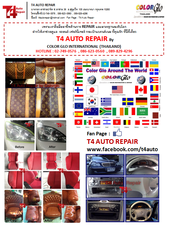 T4 Auto Repair by Color Glo International (Thailand) ที่นี่ที่เดียว บริการซ่อมและ Repair รถยนตร์ เฟอร์นิเจอร์ กระเป๋าแบรนด์เนม ฯลฯ ด้วยมาตรฐานสากล และช่างมืออาชีพ T4 Auto Repair ซอยลาซาล 36 Hotline ตั้ม 086-623-0560 , ไทม์ 089-829-4296 Line: teddytime ^^