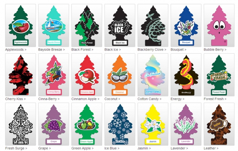 มีหลากหลายกลิ่นให้เลือกทั้ง Vanillaroma, New Car, Cotton Candy, Berry Patch, Morning Fresh, Orange Squeezed, Jasmin, Black Ice, Royal Pine (ไม้สน), Spice (อบเชย), Vanilla Pride, Wild Cherry, Ice Blue, Fresh Surge, Green Apple, Passion, Bouquet, Victory Lane, Blackberry Clove, Black Forest, Pina Colada ฯลฯ