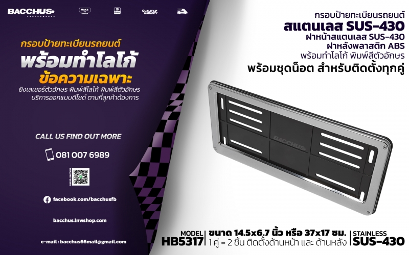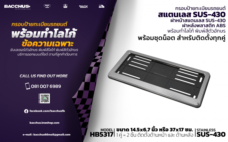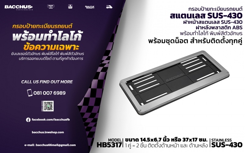 รับผลิตจำหน่ายกรอบป้ายทะเบียนรถยนต์สแตนเลส ฝาหน้าสแตนเลส STAINLESS SUS-430 ฝาหลังพลาสติก ABS พร้อมท